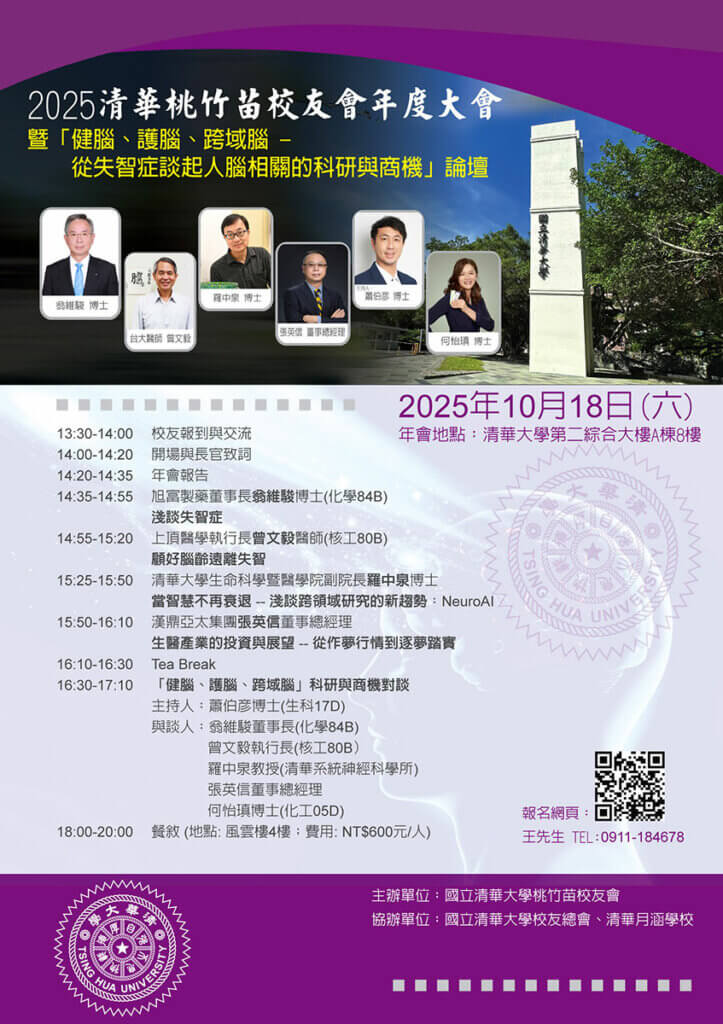 還記得曾文毅醫師在各大講座總是座無虛席的盛況嗎?這一次,他將回到母校清華大學,與專業人士同台分享對大腦健康的深刻洞見,並帶領大家理解如何透過科研與創新應對失智症挑戰。
