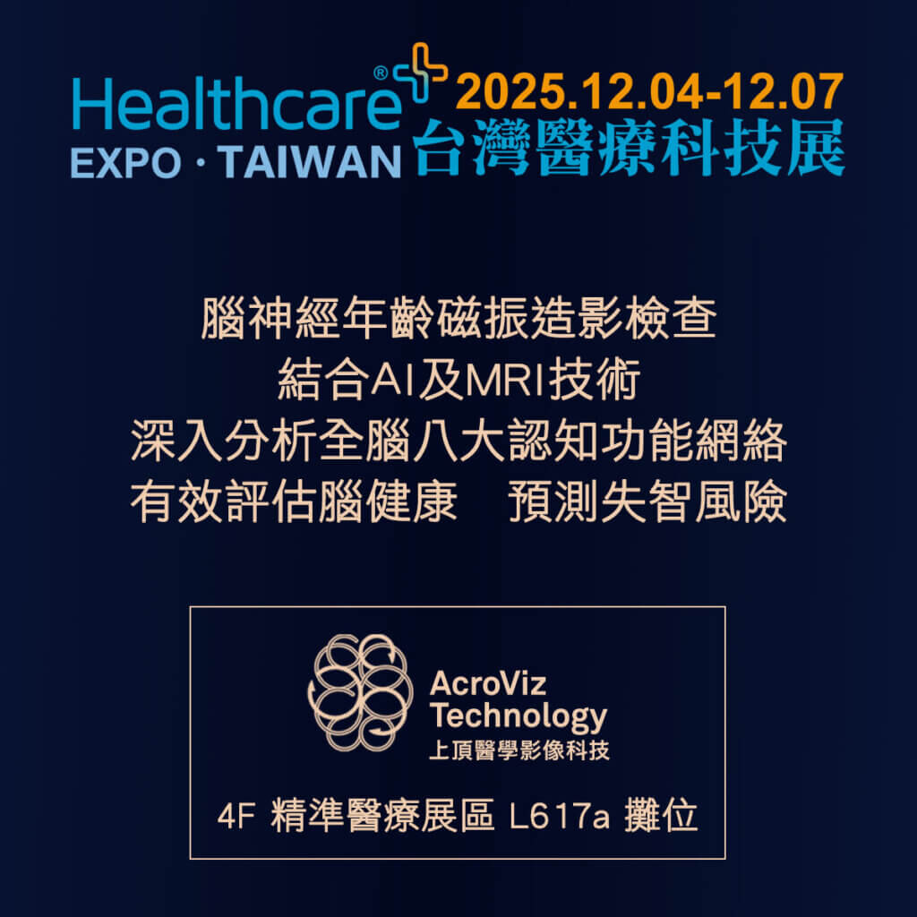 上頂醫學今年參加 Healthcare+ Expo Taiwan 台灣醫療科技展,致力將神經科學與影像研究成果轉化為可協助臨床評估與健康決策的實證工具。我們誠摯邀請醫療、科研及產業合作夥伴蒞臨交流,共同探討前沿的技術。