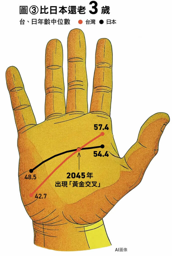 近年來,台灣與日本的年齡中位數逐漸拉近,將在2045年出現黃金交叉,到了2050年,台灣甚至比日本高出3歲。