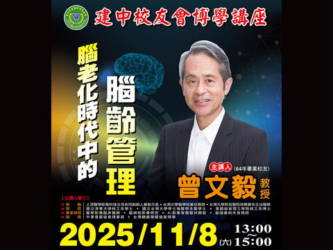 新聞/活動 【活動】2025/11/08(六)建中校友會博學講座|腦老化時代中的腦齡管理 *開放報名* 探索腦健康關鍵,了解如何透過「腦齡」掌握大腦狀態 在高齡化快速發展的今日,全球失… 2025 年 10 月 8 日